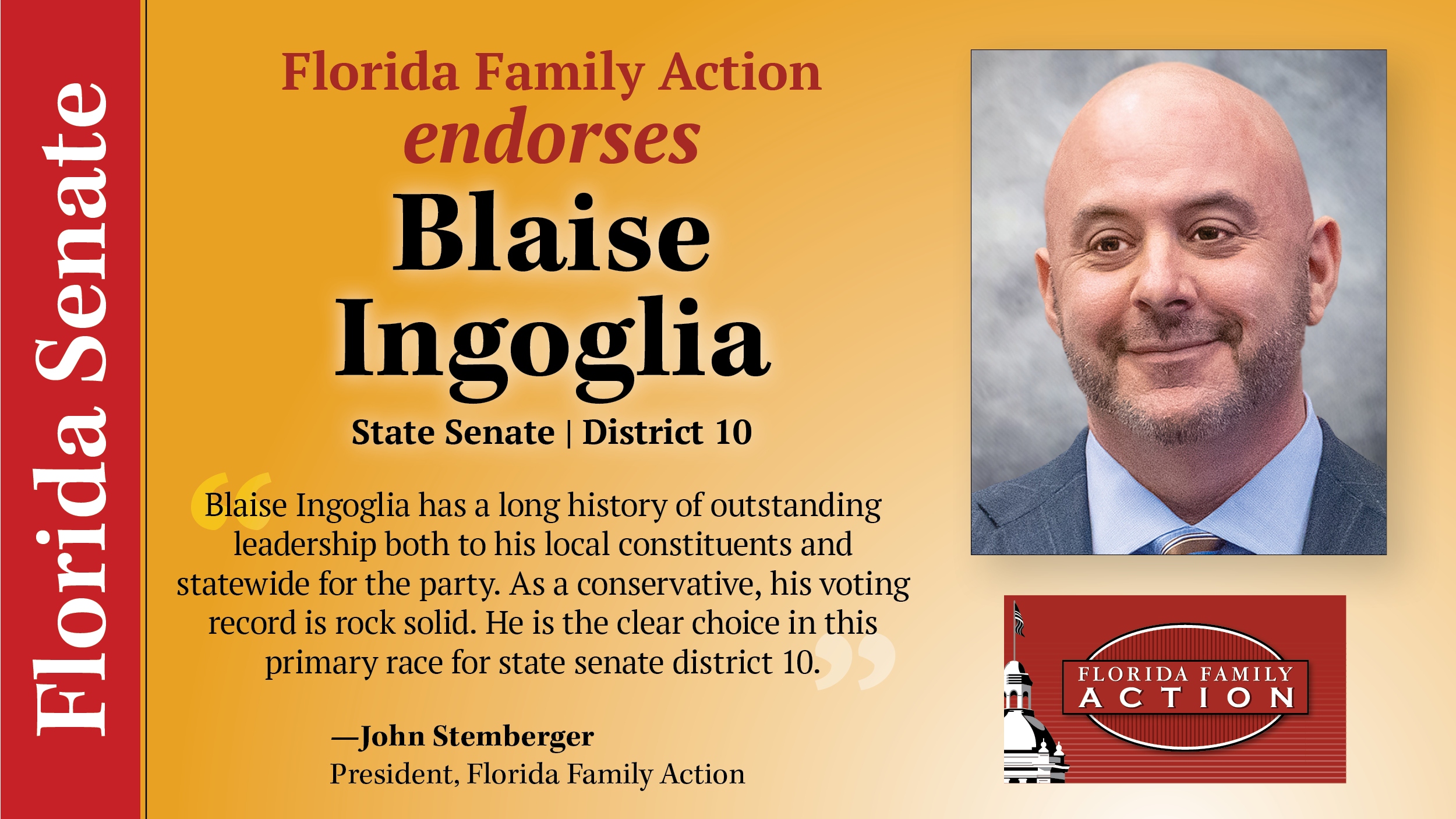 “Blaise Ingoglia has a long history of outstanding leadership both to his local constituents and statewide for the party. As a conservative, his voting record is rock solid. He is the clear choice in this primary race for state senate district 10.”